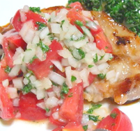 肉を焼く30分前にトマトマリネを作る。トマトは1口大にカット、玉ネギとパセリは微塵切りにしてボールに入れ、オリーブオイル・レモン汁・塩と混ぜて冷蔵庫で冷やしておく。